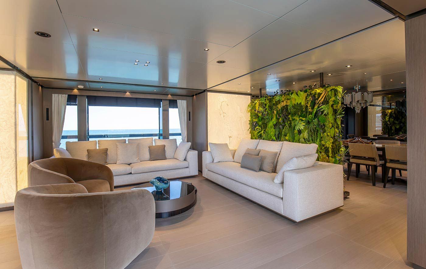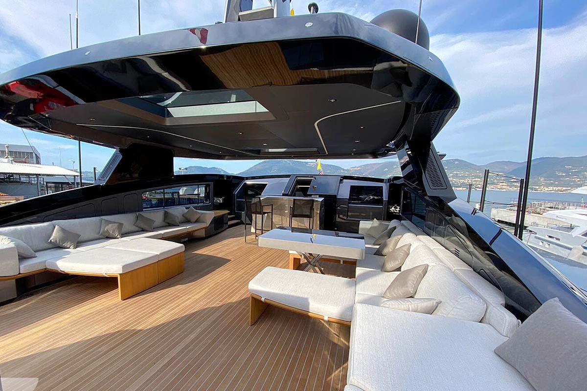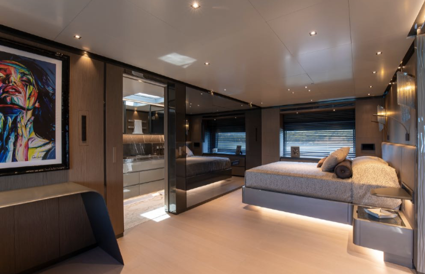 Outside, the expansive decks invite endless relaxation and entertainment: soak in the custom saltwater pool on the flybridge, unwind in the jacuzzi with panoramic views, or dive into the crystal-clear waters from the triple-sided beach platform.