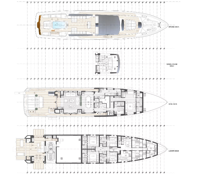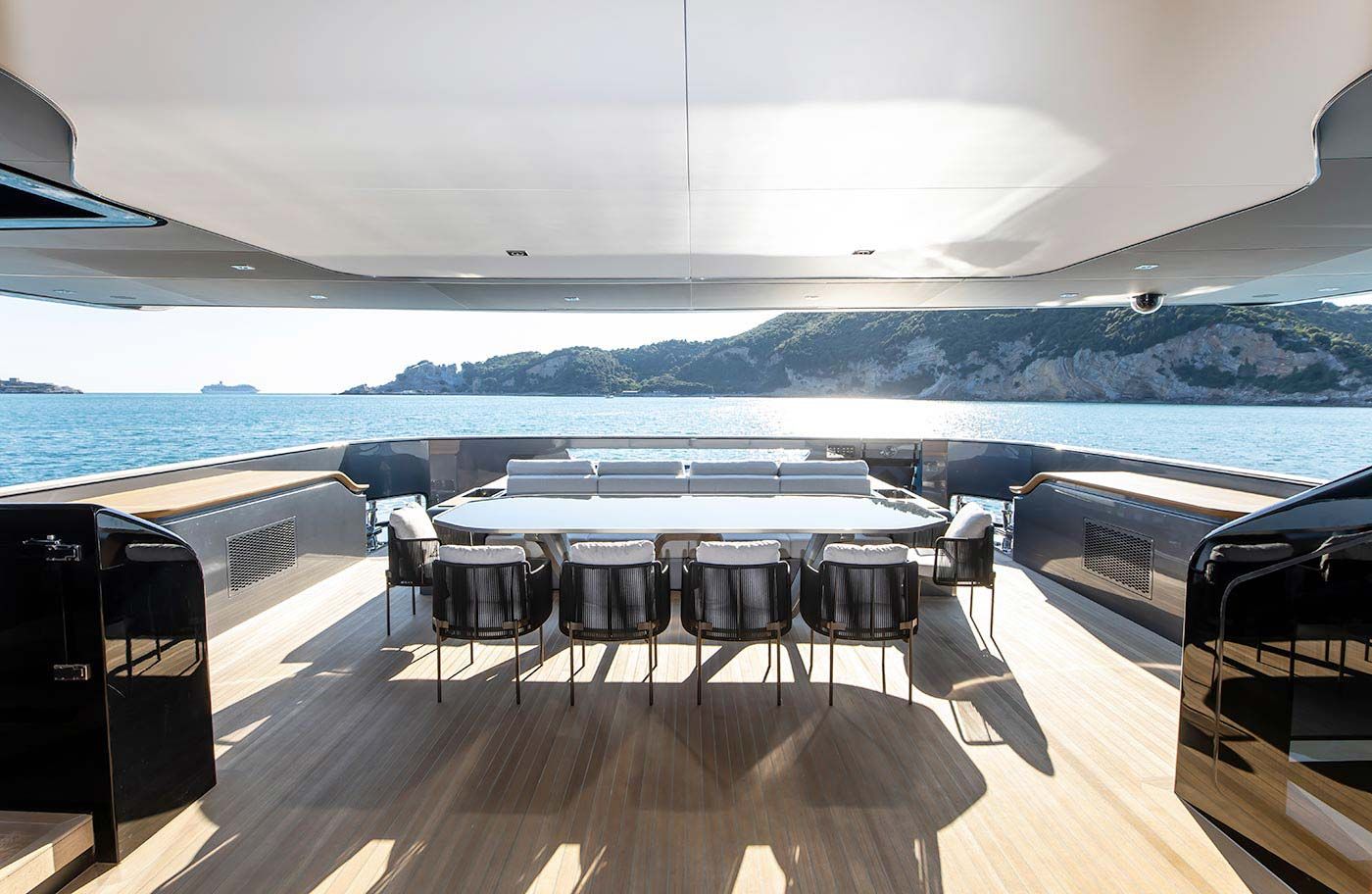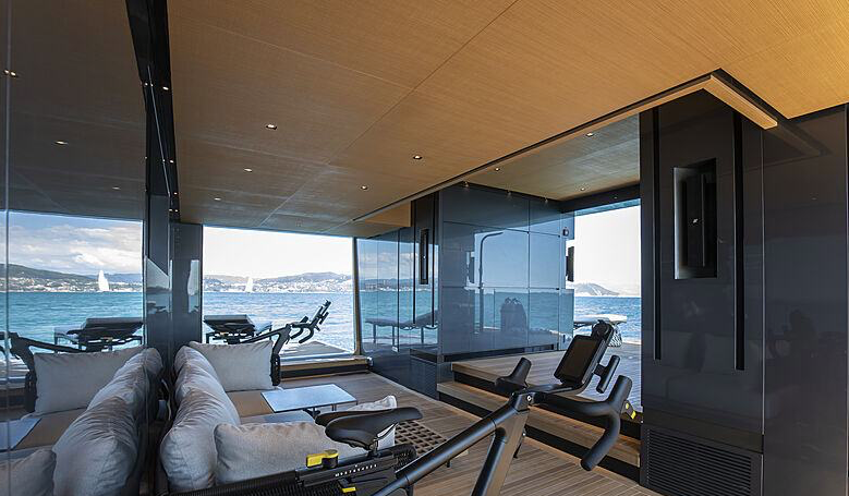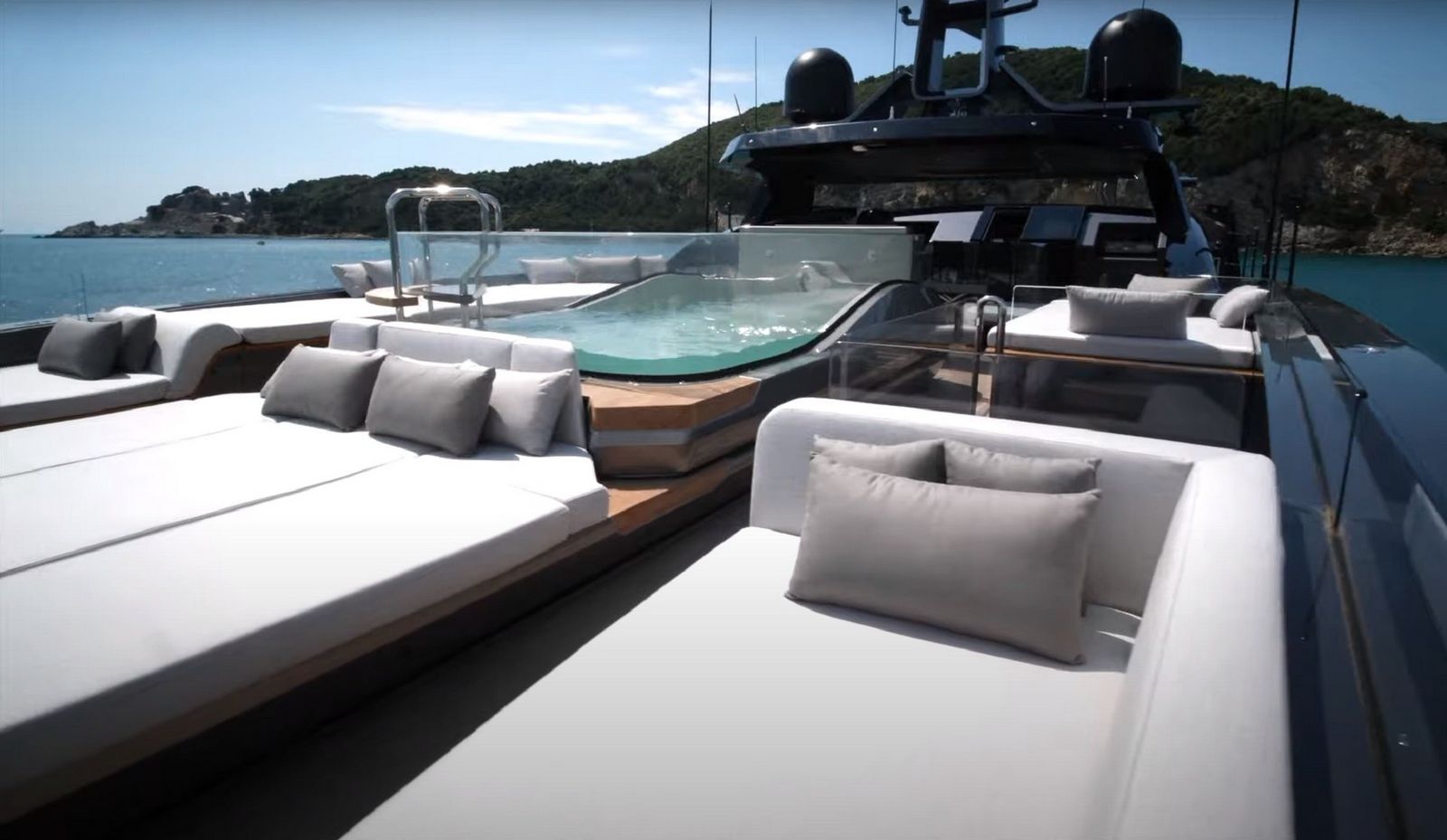 Features: Full beam stateroom with electric folding side balconies / Hamman spa / Beach club platform / Semi-float-in tender garage / Infinity pool with counter current swimming system