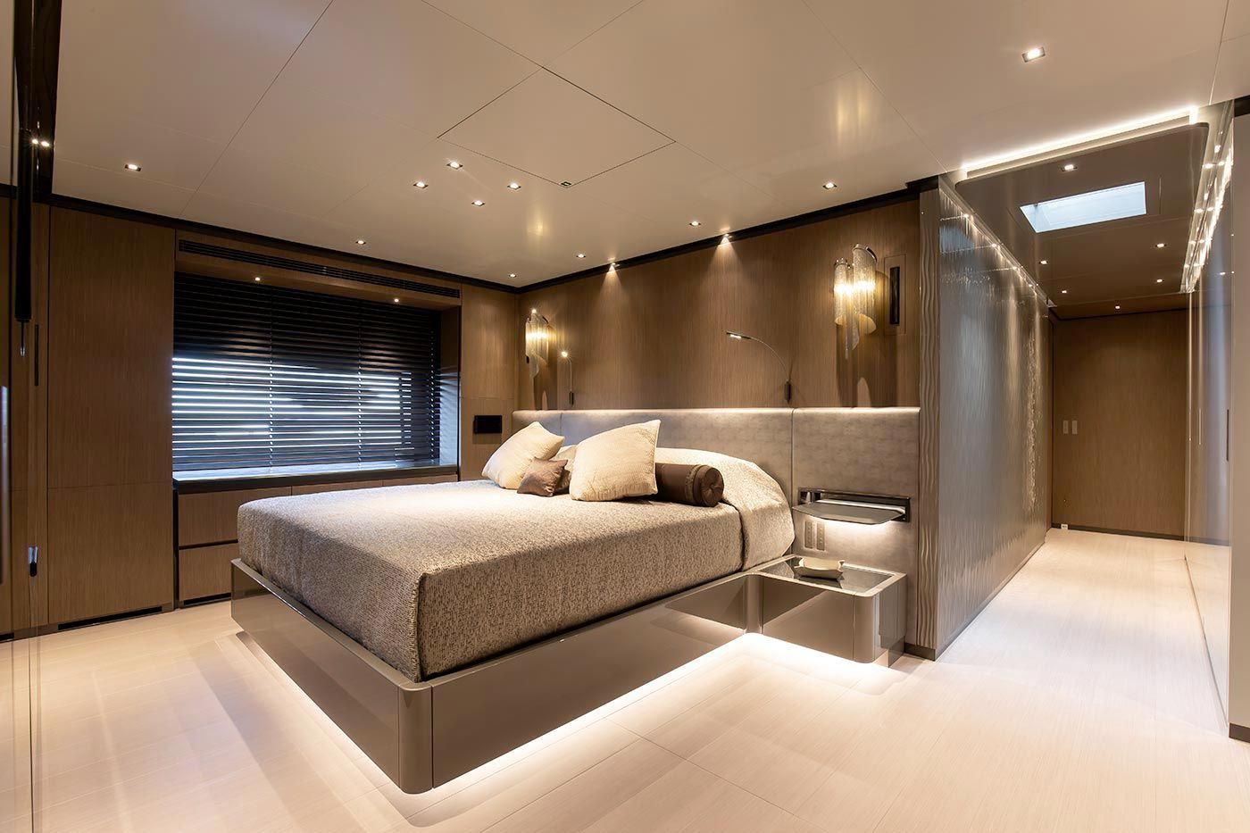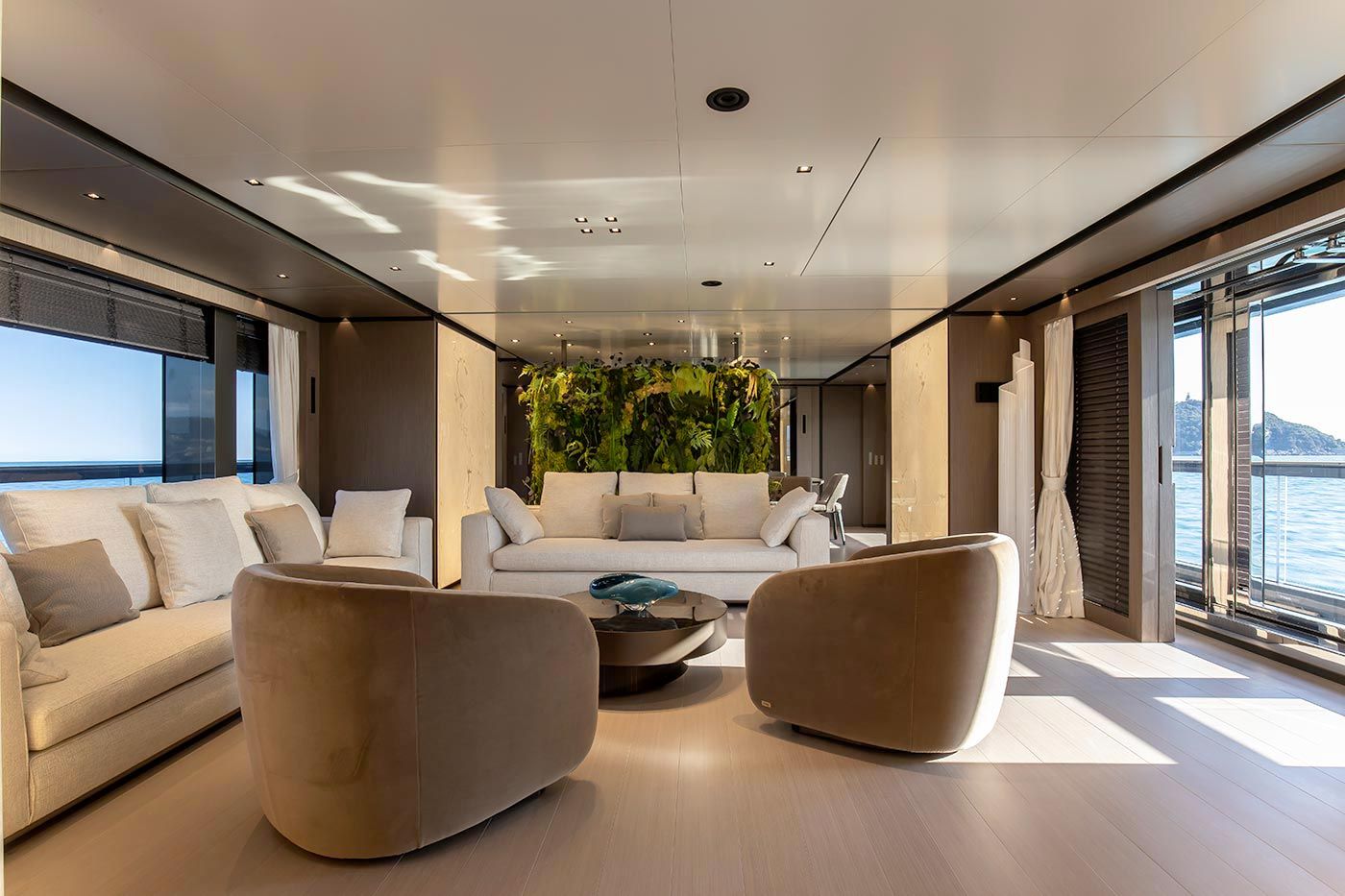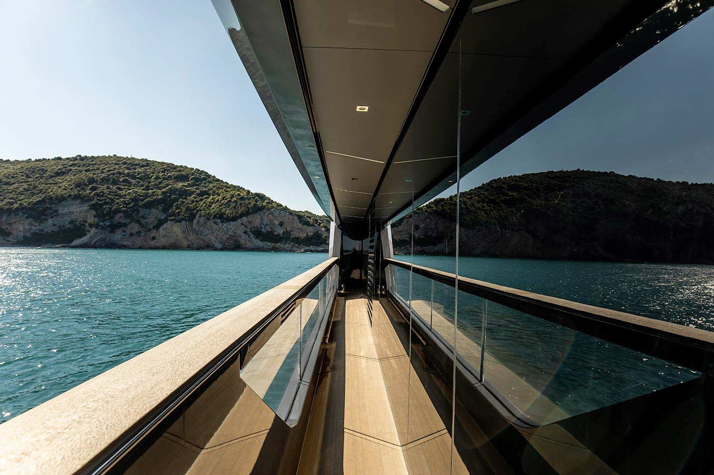 Features: Full beam stateroom with electric folding side balconies / Hamman spa / Beach club platform / Semi-float-in tender garage / Infinity pool with counter current swimming system