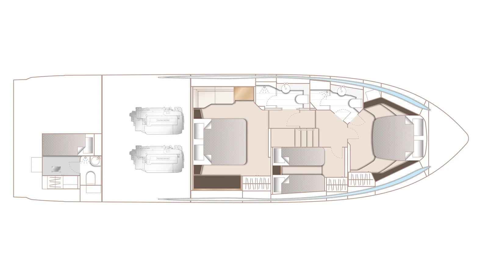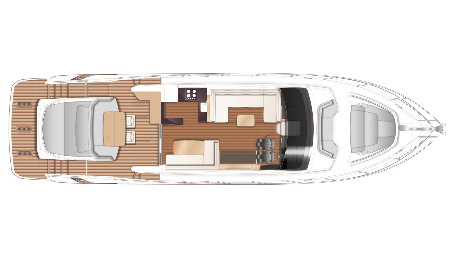 - Entertainment Spaces: Open-plan galley, seamless indoor/outdoor flow, aft deck with wet bar and grill.